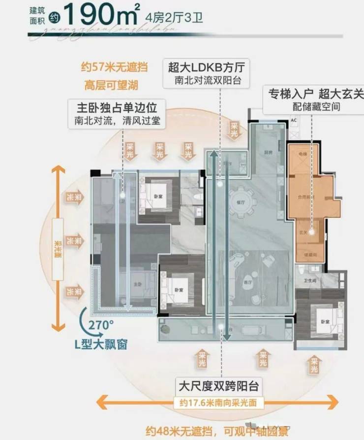 约15米转角阳台(可划分N个区域),270°环岛式景观阳台,与绝美湖景融为一体。270°观景边厅,自带IMAX级巨幕视野,在客厅沙发上闲坐或者在餐厅用餐时,不经意间一抬头,湖景园林的静谧、城市天际的璀璨皆收入眼底。另外还有分离式中西双厨+岛台的设计。