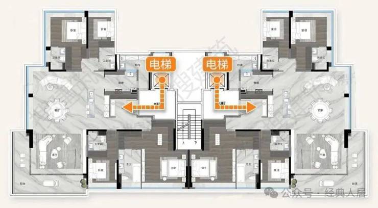 2梯2户设计,两条梯腿楼栋并列分局,电梯位于核心筒中间,业主从电梯出来后,往两个不同方向回家,互不干扰,相当于1梯1户。