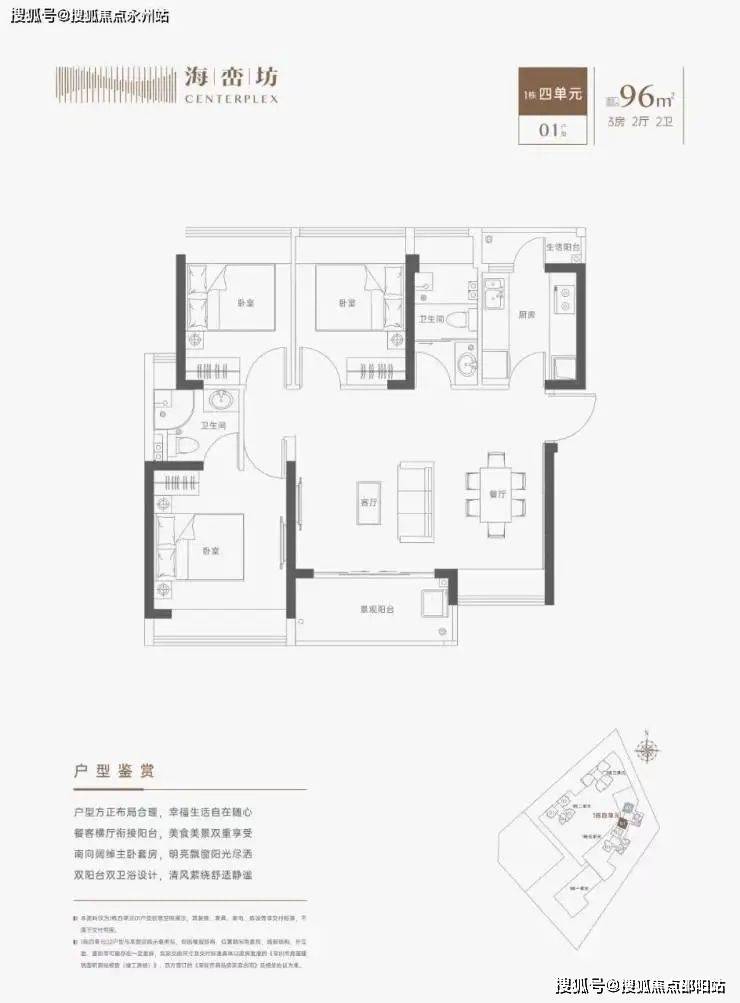约96㎡三房两卫(1栋4单元01户型)横厅南北通透格局,餐客一体,厨房带1个生活阳台,主阳台东南朝。✨✨🌈🌈海峦坊售楼处电话:400-808-7323【☎☎售楼处电话已认证】✨☃☃☃