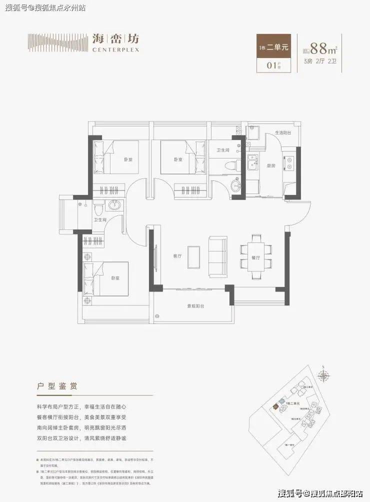 约88㎡三房两卫(1栋2单元01户型)横厅南北通透格局,餐客一体,厨房带1个生活阳台,主阳台东南朝向,但餐厅位置受楼栋设计原因,有遮挡。