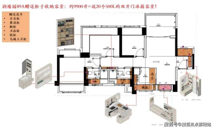 以89㎡A户型为例,赠收纳柜容量约9900升,相当于20个500L冰箱。