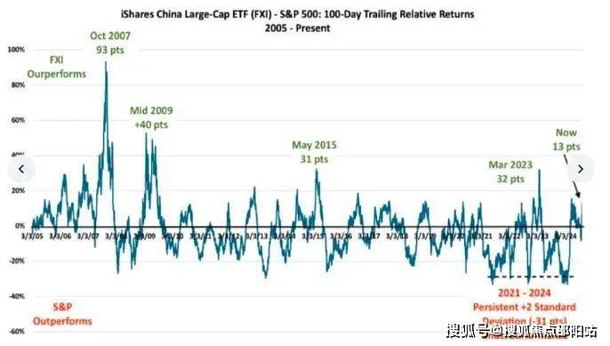 研究机构DataTrek Research表示,如果以历史经验为鉴,中国股市本轮反弹可能还有很长的路要走。该机构对比了iShares中国大盘股ETF(FXI)与SPDR标普500 ETF(SPY)在100天滚动时间跨度内的相对表现。其发现,在“中国政策发生积极转变”的时期,如2009年、2015年和2023年,中国股票的表现通常会超出美股30个百分点或更多。而现在,相对的超额回报还只有13个百分点。