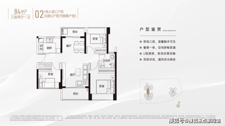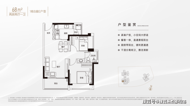 竖厅格局,客厅3.4米开间,LDKB一体化设计,动静分区,L型厨房还带1个生活阳台,卫生间三段式干湿分离,得房率约79%(不含赠送),东北朝向。