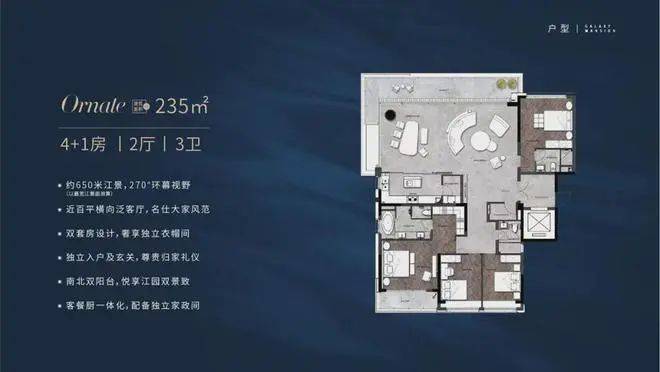 星河江缦结合现代建筑美学与高端居住理念,以头排江景和奢华配套为亮点,打造一个全新的滨江豪宅标杆。项目总户数324席,采用全板式户型设计,户户南向观江,LOW-E超白环幕玻璃实现270°IMAX视野。项目内部规划豪华双入户大堂、高端智能家居系统和贝克洛专利系统门窗,满足高端圈层对生活品质的极致追求。
