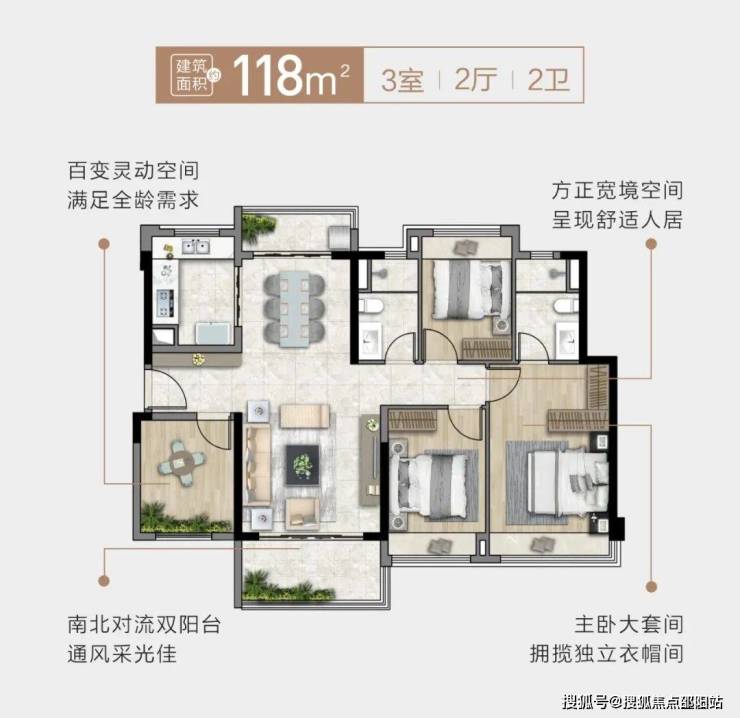 :采用 “全生命周期” 设计理念,有 89㎡、107㎡、118㎡、120㎡、150㎡等多种户型可供选择,满足不同家庭结构和人生阶段的需求。例如 120㎡四房户型,做到五开间朝南、南北对流,通风采光俱佳,还带有专梯入户、270° 转角飘窗、超高赠送等优势,实用率超 100%