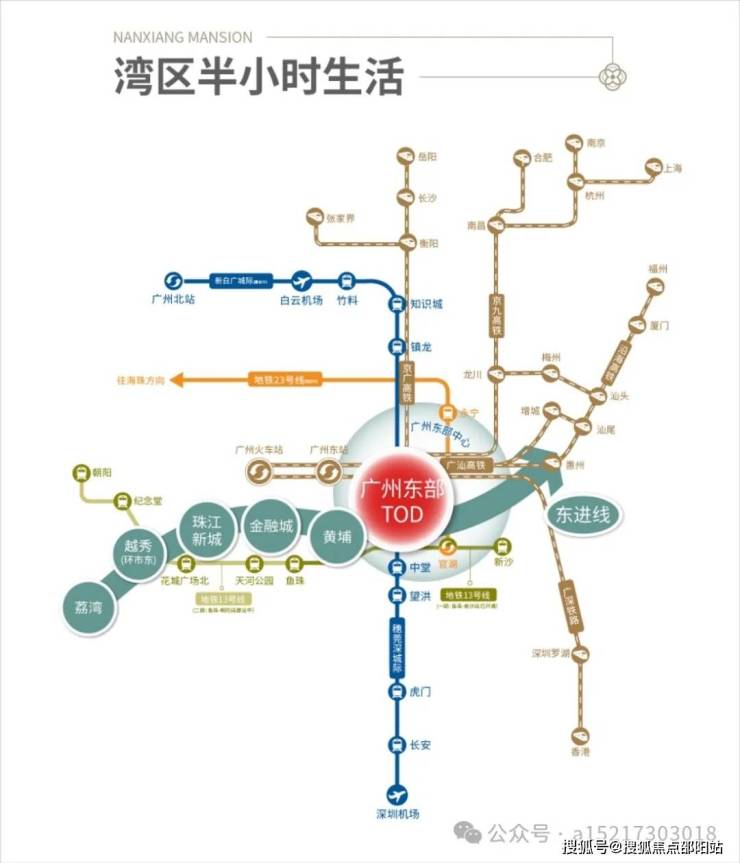 ·依托广州东部TOD(距离4公里)汇聚5地铁、3铁路、2城际等10轨交汇,实现1站速达黄埔,打造“半小时湾区生活圈”