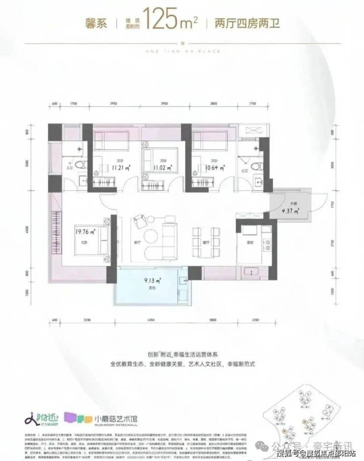 125㎡的4房2厅2卫,2栋2/3单元01户型,设计的是横厅南北通透格局,独门独户,赠送约4.37平的入户空间,客餐厅7.15米开间,LDKB一体化设计,四开间朝南,分别做到了主卧19.76㎡/次卧11.21㎡/次卧11.02㎡/次卧10.64㎡(包含墙体飘窗),客厅出阳台约9.13平,U型厨房,卫生间干湿分离,得房率约99.29%(包含赠送),西南朝向。飘窗赠送面积15.18㎡+阳台赠送4.56㎡+外廊赠送4.37㎡=实际赠送24.11㎡。