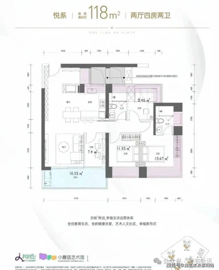 118㎡的4房2厅2卫,1栋2单元03/04户型+2栋1/2/3单元03.04.05户型,设计的是竖厅格局,进门约6.12平的入户玄关位,客厅3.5米开间,LDKB一体化设计,四开间朝南,动静分区,分别做到了主卧15.67㎡/次卧11.35㎡/次卧8.46㎡/次卧7.4㎡(包含墙体飘窗),客厅连接次卧出5.75米长的大阳台约10.35平,U型厨房,卫生间干湿分离,得房率约96.5%(包含赠送),西南或东南朝向。飘窗赠送面积14.31㎡+阳台赠送面积5.17㎡=实际赠送19.48㎡。