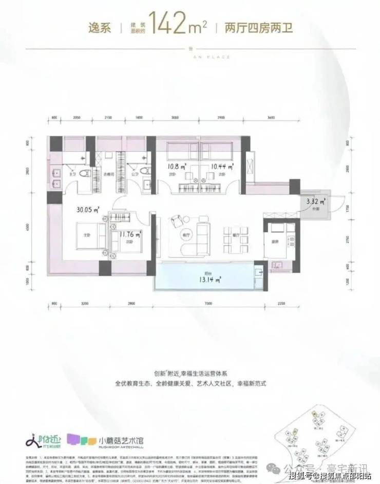 142㎡的4房2厅2卫,1栋2单元05户型/2栋1单元01户型,设计的是横厅南北通透格局,独门独户,赠送约3.32平的入户空间,客餐厅7.3米开间,LDKB一体化设计,五开间朝南,主卧带大衣帽间,分别做到了主卧30.05㎡/次卧11.76㎡/次卧10.8㎡/次卧10.44㎡(包含墙体飘窗),客厅连接餐厅出7.3米长的大阳台约13.14平,U型厨房,卫生间干湿分离,得房率约103.95%(包含赠送),西南或东南朝向。飘窗赠送面积24.12㎡+阳台赠送6.57㎡+外廊赠送3.32㎡=实际赠送34.01㎡。
