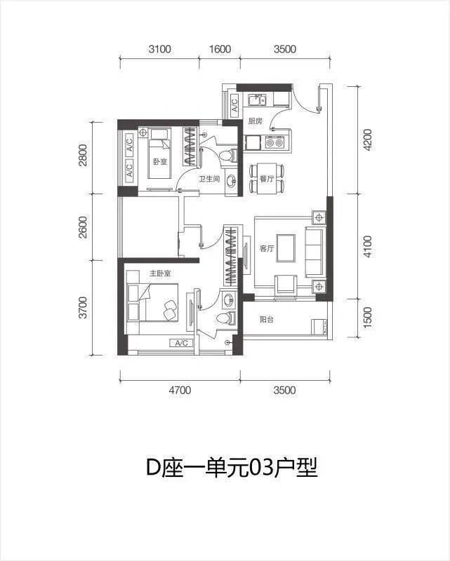 D栋一单元03户型:93㎡ 3房2厅2卫