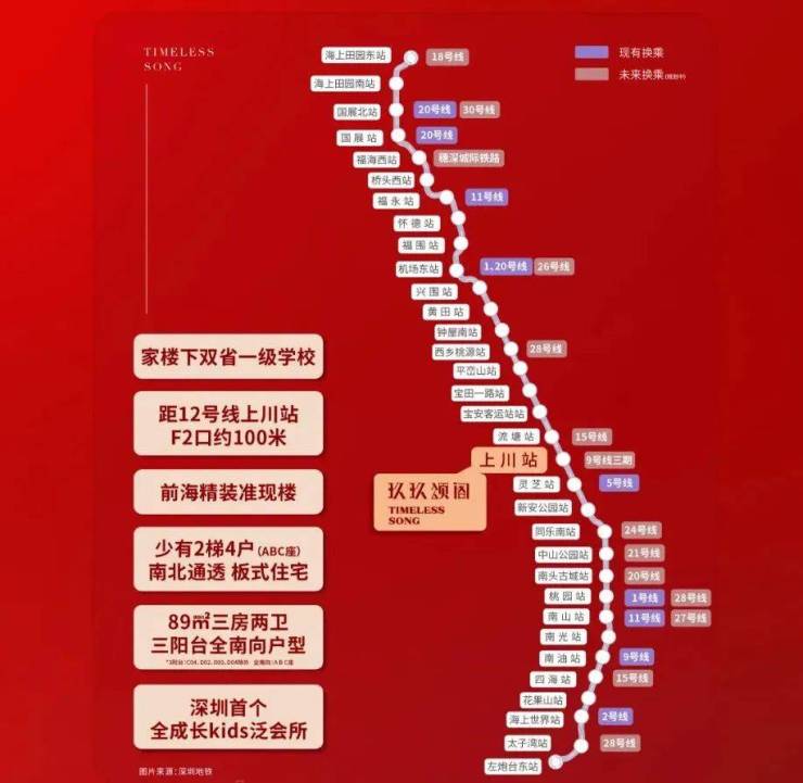 项目周边目前已开通的地铁5号线,同时享受在建12号线预计年底通车(上川站约700米)、15号线(规划中)共三地铁线环绕,自驾由广深公路行、宝安大道,30分钟可达福田、南山、宝安中心区。