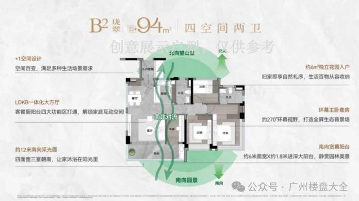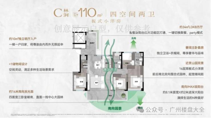 110㎡四空间,专梯入户,四开间朝南,南北双向围合式园林景观,更有超大LDKG空间,一键切换聚餐、party模式。并且,南向双主套,做到生活平权。