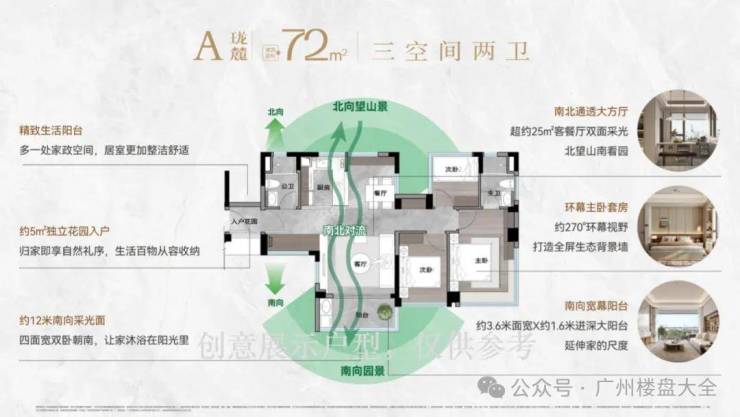 72㎡,是老黄埔最小的产品,但实现了三房两厅两卫,其他项目哪怕突破80㎡,也只能实现1.5卫。不仅是朝南,更是拥有南向园景+北向山景双重视野。