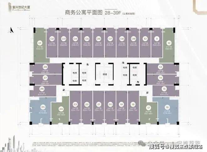公寓8梯28户,办公6梯15户,商业4梯34户