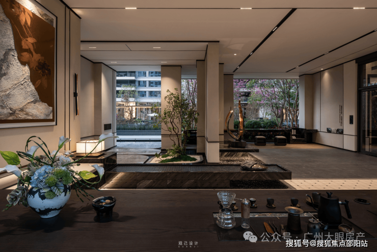5栋的「云栖·西派艺术馆」 雕塑长廊与立体庭院串联,巧妙地陈设“风”字的金属雕塑、形似层峰叠峦的艺术壁画、融入白云山沉淀的绿宝石。