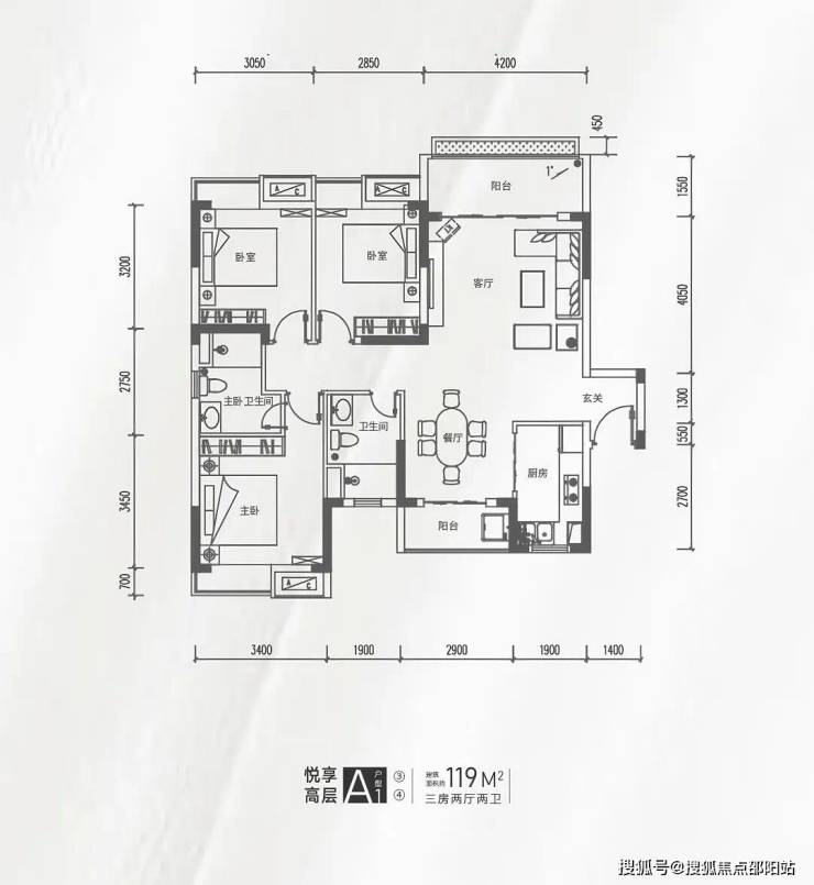 💎在售户型:建筑面积约99-100㎡三房两厅一卫、约116-119㎡三房两厅两卫