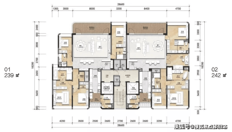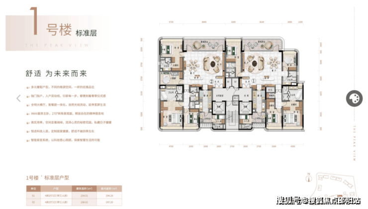 建面约239㎡的户型拥有一个宽度为8米的阳台,而建面约242㎡的户型则拥有一个宽度为8.4米的阳台。这两个户型的实用率为83.6%。
