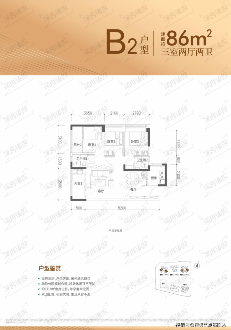 86㎡的3房2厅2卫,设计的是竖厅格局,客厅3.5米开间,进深8.2米,LDKB一体化设计,三开间朝南,3个卧室分别做到了主卧13.59㎡/次卧7.95㎡/次卧6.06㎡(实测面积,去掉墙体飘窗),U型厨房,公卫三段式分离,得房率约88.08%(包含赠送),东南或西南朝向。