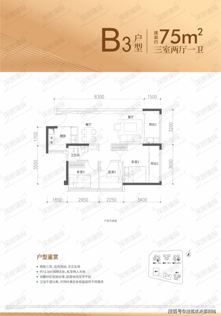 75㎡的3房2厅1卫,设计的是竖厅格局,客厅3.2米开间,进深8.3米,LDKB一体化设计,3个卧室分别做到了主卧13.06㎡/次卧6.8㎡/次卧5.22㎡(实测面积,去掉墙体飘窗),U型厨房,卫生间三段式分离,得房率约91%(包含赠送),东南朝向。