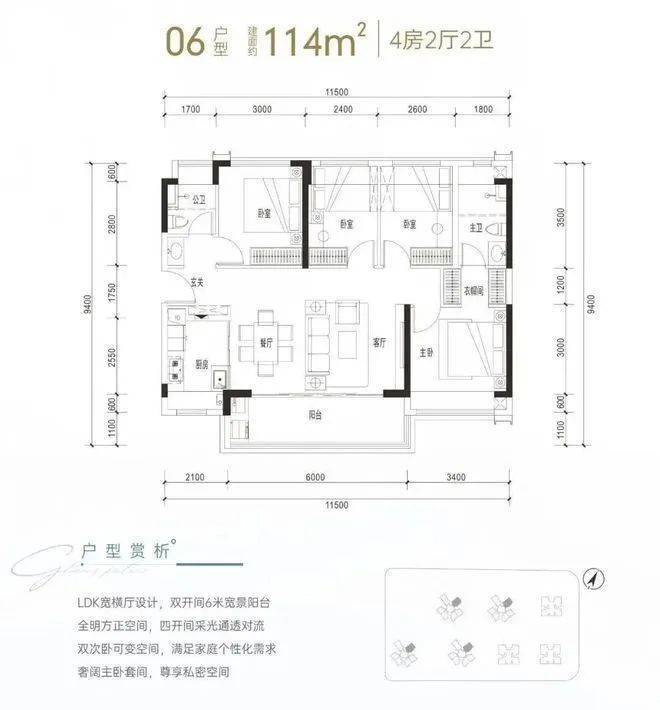 建面约114㎡是传统短进深大开间横厅格局,通透性很好,客厅进深6米,开间4.3米(不含阳台),配有6米宽景阳台,主卧套间设计,配衣帽间和三段式卫生间,这个户型很比较讨喜年轻的购房群体。