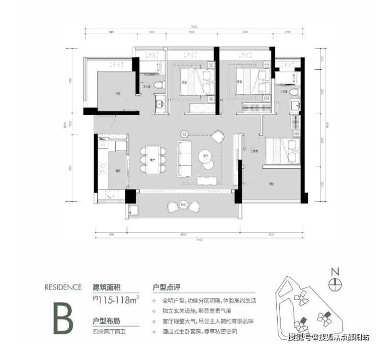 约115-118㎡的产品分别每个楼栋都有一条腿,设计独立玄关,功能分区明确,客厅大气,尺度疏阔。