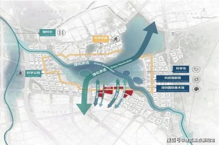 以科学公园为轴心,深圳国际美术馆及深圳科学馆(新馆)为主角,结合本案核心节点,形成超宽城市视廊,如开启城市的大门,将绿脉引入街区。