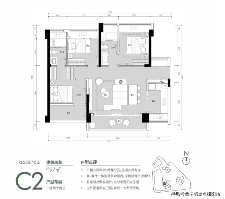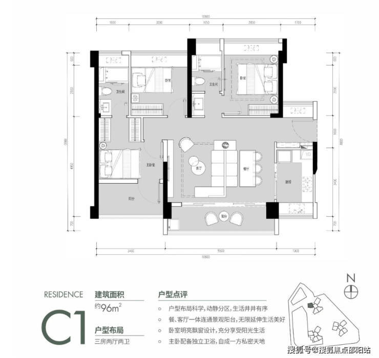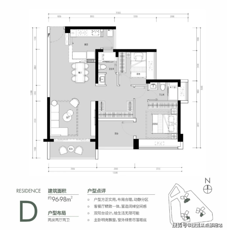 约96㎡户型的空间尺度进一步拉伸,且都是朝南的。