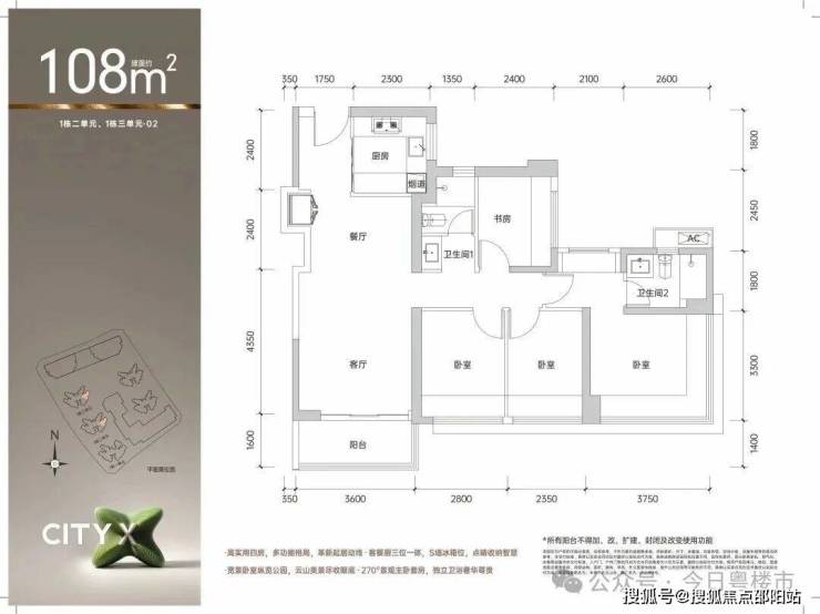 108平的户型拥有约3.6米开间,全南向客厅和卧室。