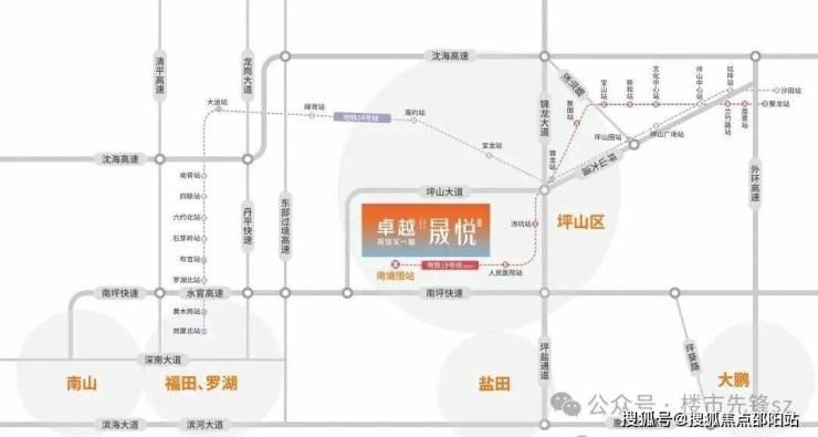 超集快速畅达:南坪快速、东部过境高速(在建中)、坪盐通道,3条快速速抵罗湖福田,约15km盐田沙头角、约25km罗湖莲塘/香港、约35km福田、约40km南山