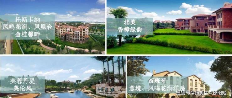 项目目前已经有北美、西班牙、意大利和英式四大风格的建筑,其中北美风格的联排别墅组团“香樟绿韵”和西班牙风格的洋房组团“凤鸣花涧”
