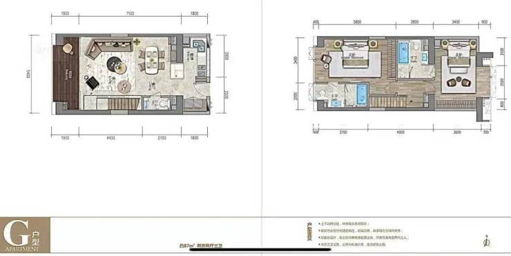 88㎡复式三房两厅三卫 南北通透,5.4米大开间,复式下层餐厨客厅连宽景阳台,复式上层私密卧房全明采光,动静分区私享个性生活。