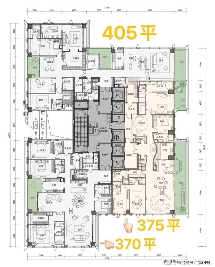 ②高区42F起(150-200米)是约370-375-403㎡4+1房五卫+家庭厅+家政套间;