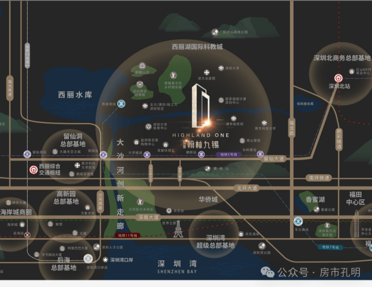 留仙大道正席,紧邻地铁5号线塘朗站,4/5/7号线3轨环绕,毗邻“三纵五横”主干道,瞬息通达全城。西丽高铁站(建设中)、深圳北站两大枢纽环绕,拥有世界交通能级。