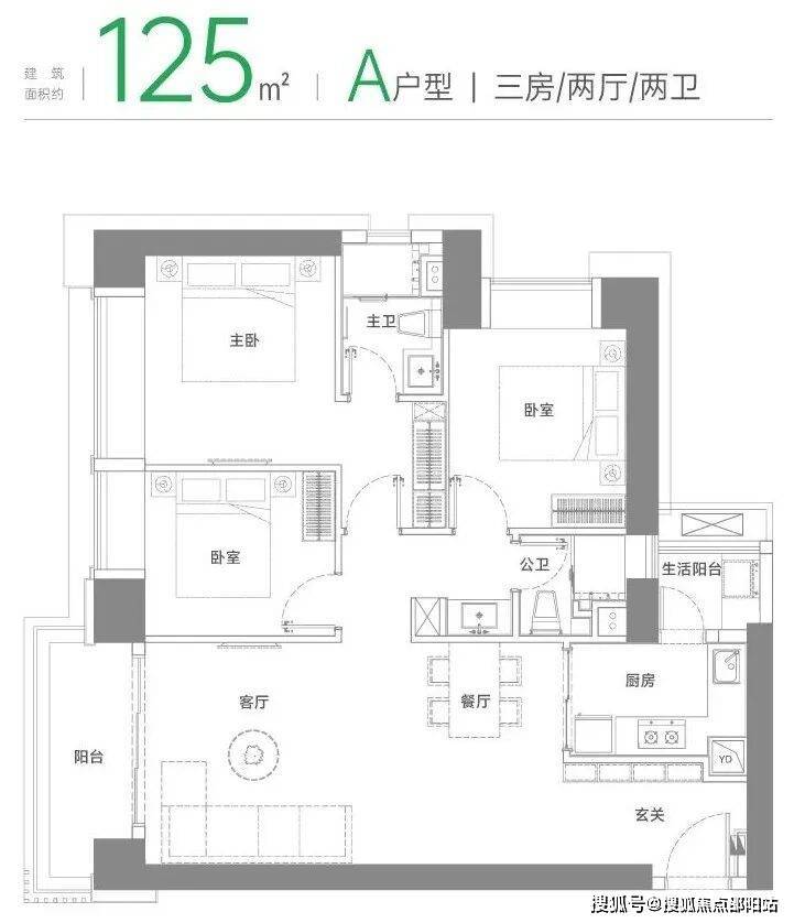A户型 建面约125㎡三房两厅两卫
