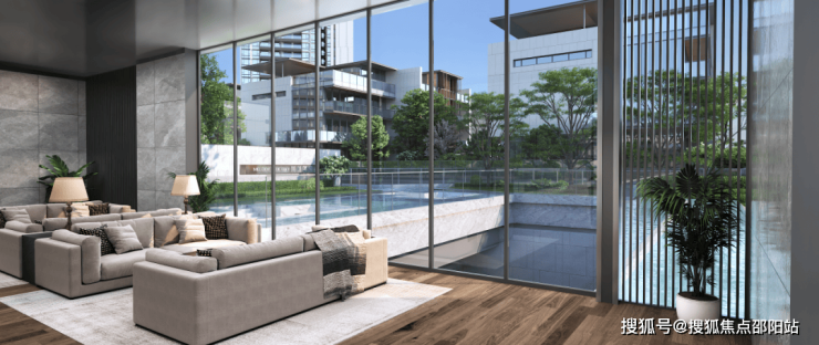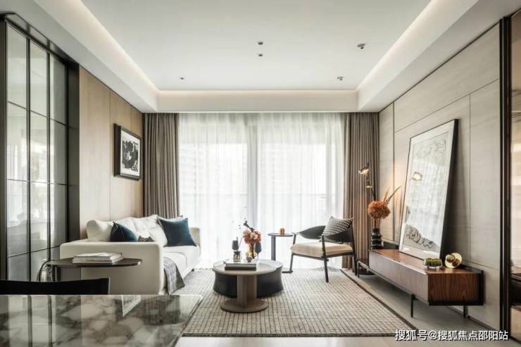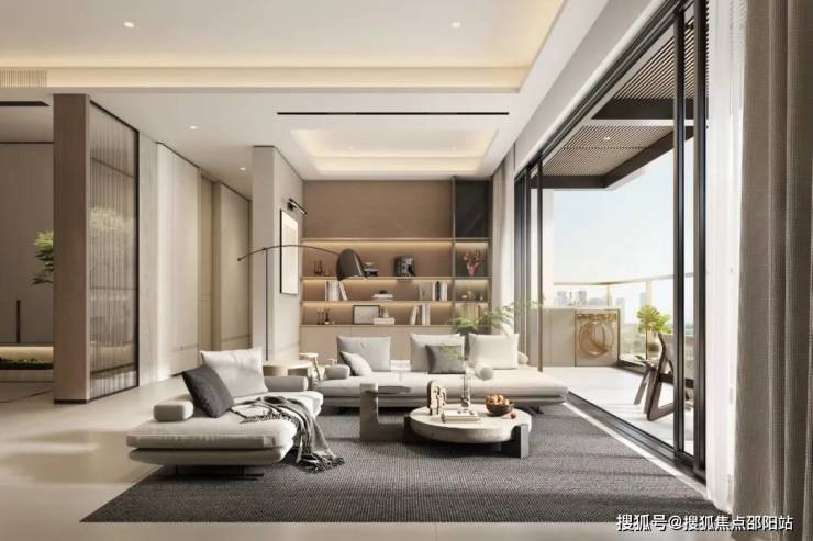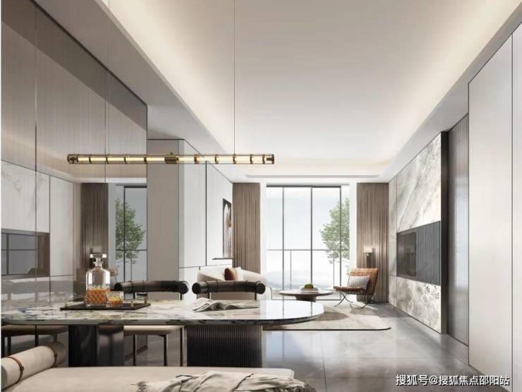 电视背景墙选用高端品牌,由岩板与金属线条简单勾勒,大气非凡,会客更显尊崇。阳台宽幕视野,直面约2.5万方中央花园诗意盛景,四季流转尽收眼底。