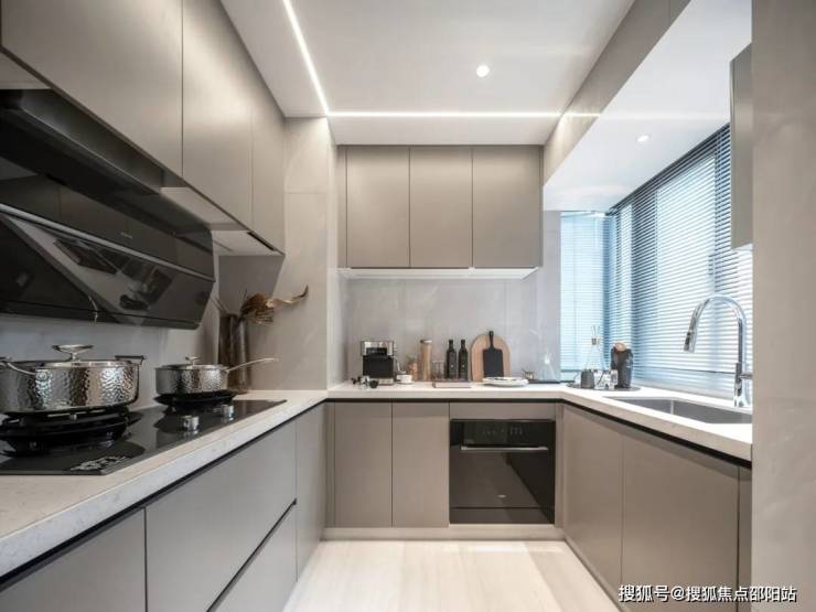 U型厨房配备极窄不锈钢金属框边夹丝玻璃吊柜推拉门,隔开厨房油烟,更易清洁打理。