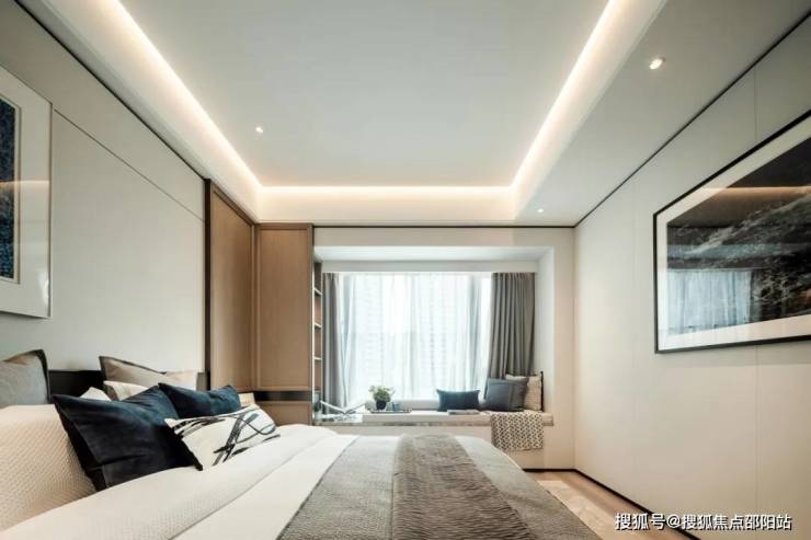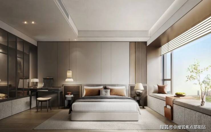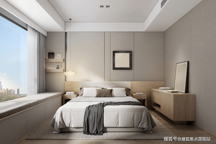 面积约20㎡的主卧套房,空间尺度大气,搭配双飘窗延伸空间,南北通透,舒适清爽,床头硬包与木饰面处理,置身于主卧枕星光入眠,私享静谧。