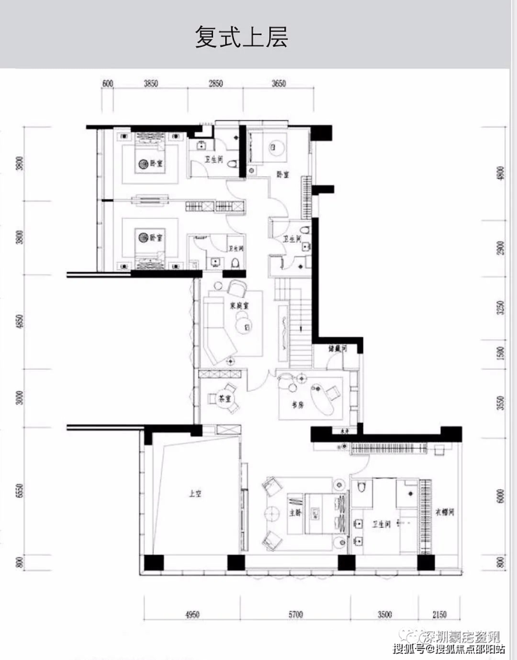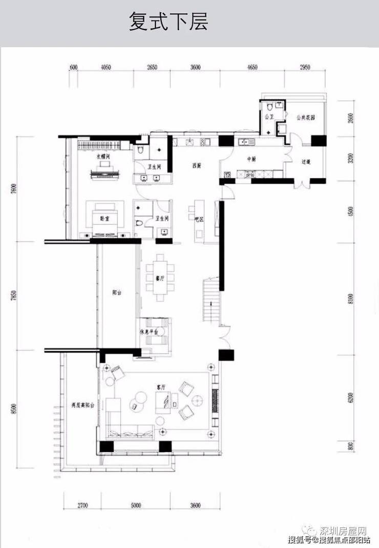 A栋共35套545平米复式5+1房,01西端头户型仅17套珍藏版户型,02东端头户型18套,全部精装交楼,两梯一户,电梯刷卡入户。