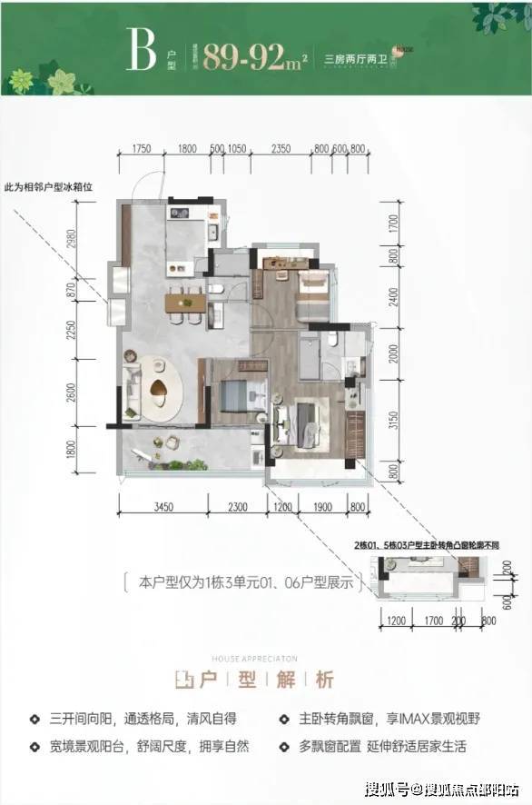 招商雍境名邸位于宝安沙井大前海会展湾片区的招商会展湾雍境名邸,本次是招商会展湾雍境二期,首推1栋3单元的195套房源,面积段有80㎡3房1卫,91㎡3房2卫,92㎡3房2卫3种户型,是3梯7户的普通高层,预计2027年9月精装交楼。