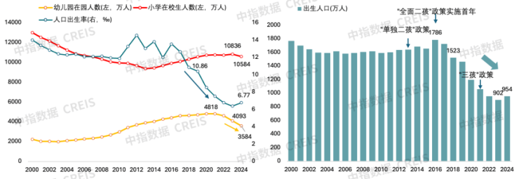 从对房地产的影响角度来看,在园幼儿和小学生规模大意味着城市拥有更多的年轻家庭,随着孩子成长过程中对居住空间需求的变化,更多改善性购房需求将得到释放,进而对城市房地产市场形成更强的支撑。其中,一线城市在较大人口基础上,在园幼儿及小学生规模均较大,广州、深圳在园幼儿均超50万,小学生数量分别达133万和124万人,规模全国领先,相对京沪更宽松的人口政策,为广深带来较为充足的人口潜力,除上海外,北京、广州、深圳小学生规模保持增长。二线核心城市中,重庆城市体量相当于中等省份,幼儿园在园人数和小学在校生人数分别达77.8和203.2万人,均居全国首位,但2024年出现明显下滑,尤其是在园幼儿减少近10万;成都规模同样较大,幼儿园人数位居全国第二位,达56.3万人,小学在校生位居全国第三,超过130万,且2024年同比增长4.4万,在核心城市中增量最大。此外,2024年郑州、西安小学在校生规模也超过百万,在园幼儿规模超35万,人口规模突出;武汉、合肥、佛山、杭州、青岛等城市小学生增量超2.5万,人口活力较强。