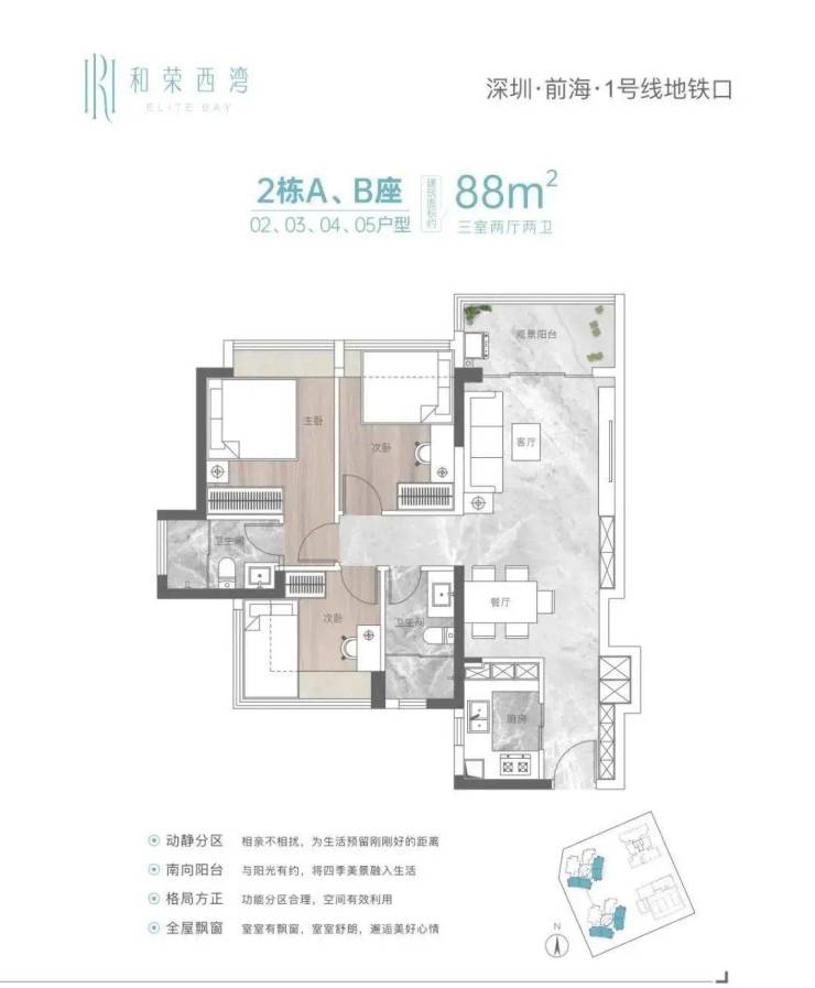 和荣西湾家园位于大前海西乡片区,直线距离约200米可至1号线固戍站地铁口,4站达宝中,6站达前海湾,3公里范围内5公园环绕,举步西湾红树林公园。项目容积率约2.88,产品为76-88-95㎡三房、100㎡四房,实用率约90%—96%,目前项目已是准现房,今年买今年住。