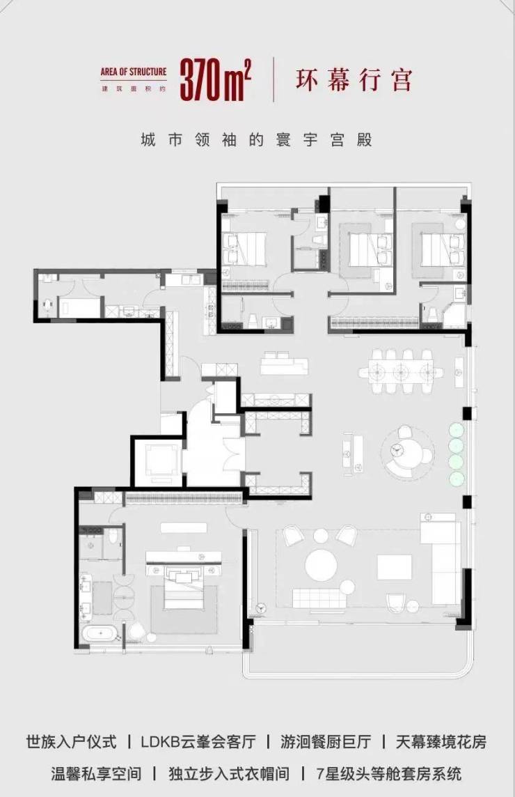 以未来生活场景重构空间,深研当代高净值家庭居住空间使用频率与需求,LDK+G引领设计、全明宽幕视野、洄游中西分厨体系、Xspace多元空间、星级套房系统等,奢阔的尺度、高奢品质与精神向往调性一致。