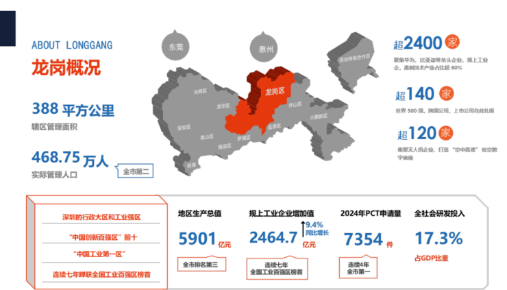 龙岗,是连续 7 年位居全国工业百强区 TOP1 的创新热土,作为粤港澳大湾区核心枢纽,正以 “全球领先的先进制造业中心”与“具有全球影响力的科技创新中心” 双定位,构建世界级产业生态。