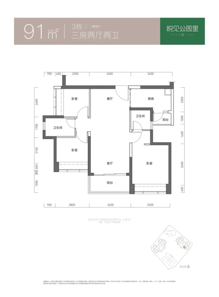 91㎡的3房2厅2卫,仅3栋2单元01户型,设计的是竖厅双龙抱珠格局,客厅3.4米开间,三开间朝南,3个卧室分别做到了主卧11.9㎡/次卧7.06㎡/次卧6.2㎡(实测面积,去掉墙体),L型厨房带1个生活阳台,卫生间干湿分离,得房率73.55%(不含赠送),西南朝向。