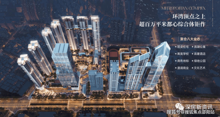 在环湾顶点之上高度聚合高端住宅、奢阔公寓、菁英学校、顶奢酒店、总部办公、绿地公园、漫调商业、文化艺术八大业态于一体,探索环湾都心、微缩城市的未来生活巅峰实践。