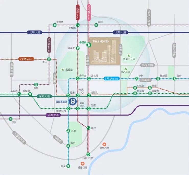 无缝接驳地铁10号线冬瓜岭站,纵享福田“一中枢、双口岸、四核心”枢纽体系,再造引桥匝道升级微循交通体系,高效互联湾区城市与全球资本。