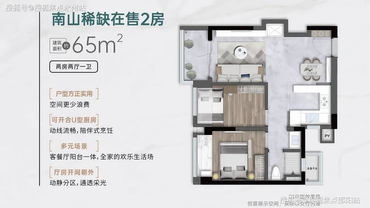 65㎡两房两厅一卫:竖厅格局,LDKB 一体化设计,客厅开间2.95米,动静分区明确;U 型厨房、三段式干湿分离卫生间,配备设备平台,得房率约88-91%(含赠送),正东、正西或正南朝向,实用面积约57-59㎡。