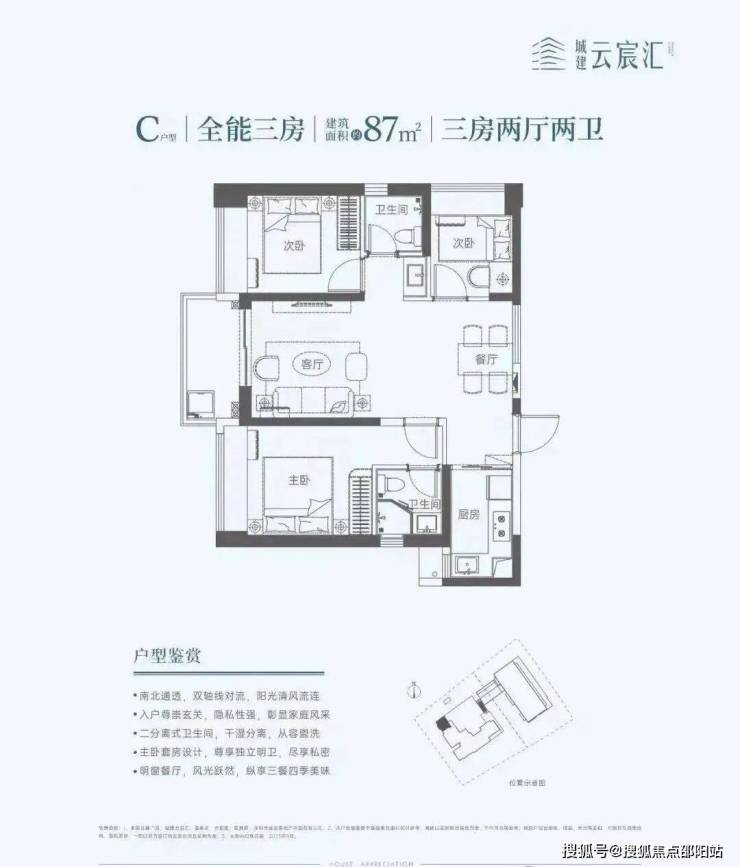 87㎡的3房2厅2卫,设计的双龙抱珠格局,餐客厅一体化,L型厨房,东南朝向。