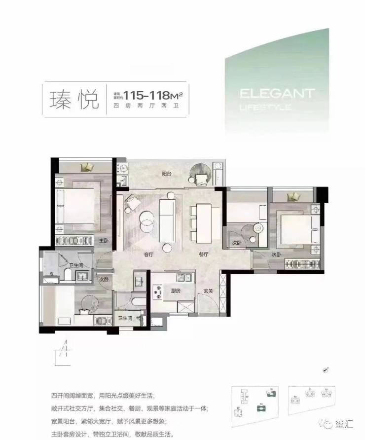 ①高端住宅:建面约115(四房两卫)542套/174(四房三卫)113套