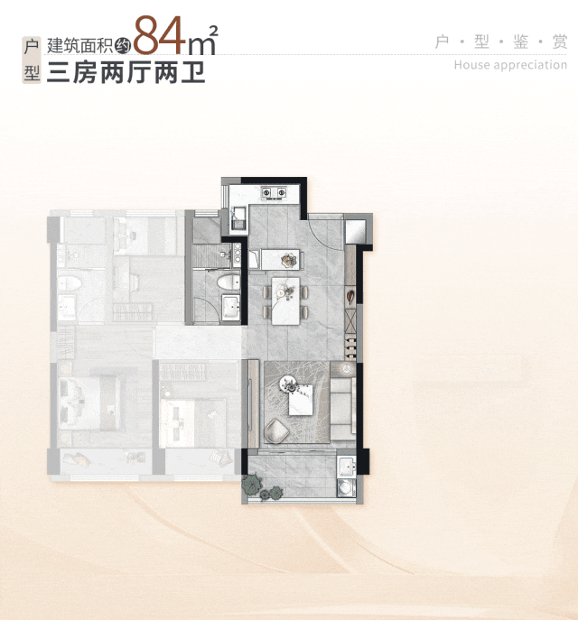 建面约84㎡三房,则是帮你将家庭打理得井井有条的生活管家。